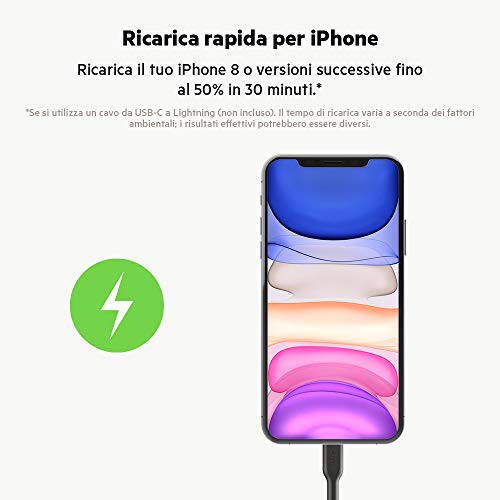 Supporta la ricarica rapida per iPhone 8 o versioni successive, iPad Pro 10.5'' e iPad Pro 12.9'' 2a gen. (0-50% di ricarica in 30 minuti con il cavo da USB-C a Lightning incluso)