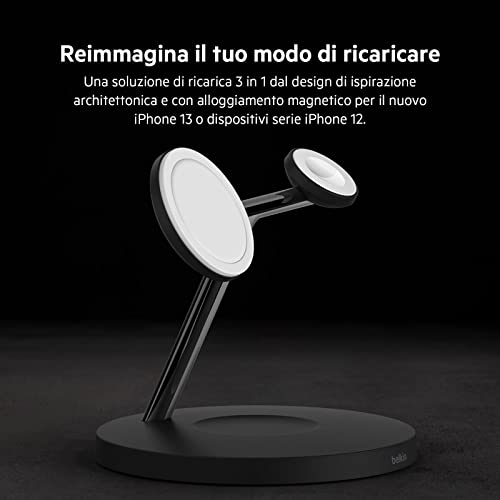 Belkin Caricabatterie wireless 3 in 1 con MagSafe, caricatore wireless rapida per iPhone (15 W) e per Apple Watch, stazione di ricarica per iPhone 15, 14, 13, 12, Apple Watch e AirPods - nero
