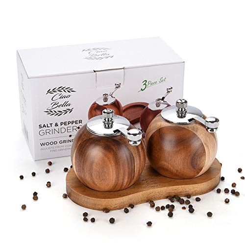 Ciao Bella - Macinasale e pepe, set da 3 pezzi per macina casa e cucina con nucleo in ceramica, in legno, ricaricabile manuale