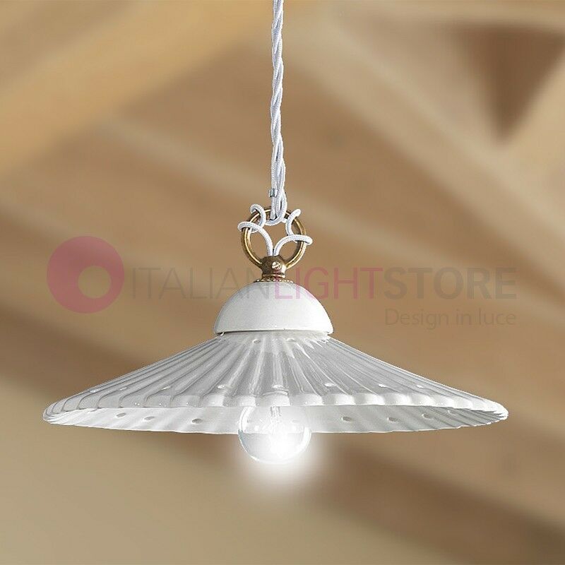 Lampada a sospensione in ceramica bianca, con diffusore d.28 cm ondulato traforato. Lampadario a sospensione realizzato a mano in ceramica bianca lucida, in stile classico rustico country, collezione Bellavista di Ceramiche Borso . La lampada ha elementi in ceramica bianca lucida;