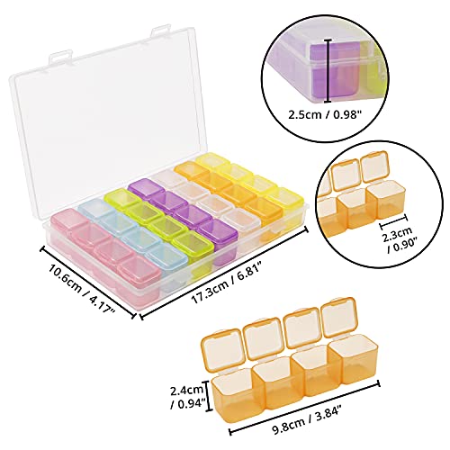 SCATOLE CON SCOMPARTI 28 SLOT: Nel nostro set sono inclusi 5 contenitori plastica con coperchio che contengono 28 scomparti singoli. Sono fissati in file di 4. L'intera scatola plastica con coperchio misura 17,3 x 10,6 x 2,5 cm. I mini contenitori plastica misurano A2,4 x L2,3 cm. La lunghezza totale di ogni linea è di 9,8 cm. Le vasche sono disponibili in rosa, viola, verde, giallo, blu, arancione e bianco. Potrai vedere attraverso i contenitori.
