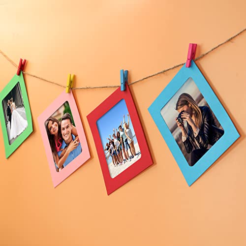 GRANDE SET DA 50 CORNICI: Il nostro set di cornici foto multiple da parete include 50 cornici da appendere in carta kraft, 50 mini mollette foto di legno e 5 filo portafoto di canapa lunghe 2,2 m. Ogni cornice con mollette appendi foto colorata misura L11,5 x L15,3 cm e ha una finestra che misura L7,8 x L11 cm. Le mollette sono lunghe 3,5 cm. Disponibili in 10 colori vivaci (5 ciascuno), come in foto, allo stesso modo, ci sono 10 mollettine di colore diverso (5 ciascuna incluse).