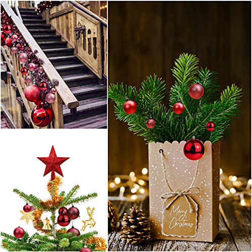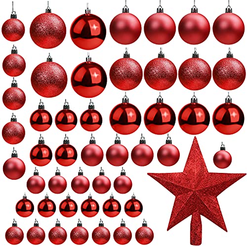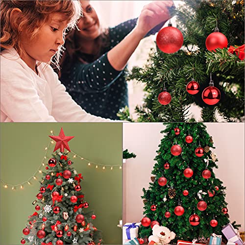 CONFEZIONE DA 50: Questo è l'ultimo set Natale decorazioni casa per l'albero! Questo kit decorazioni albero di Natale include un assortimento di palline rosse e un puntale a cilindro con stella. C'è un assortimento di palline di natale rosse grandi e piccole tutte con trame diverse e il topper con stelle glitterate è super scintillante.