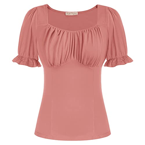 Belle Poque Camicia in cotone con scollo quadrato a maniche corte e maniche corte vintage da donna, rosa, S