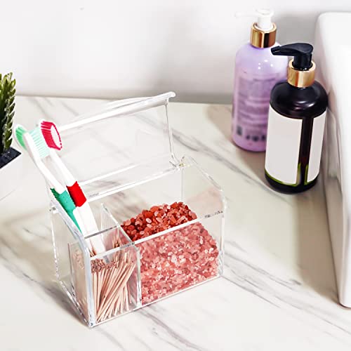 MANTIENI LA TUA CASA IN ORDINE E ORGANIZZATA: La nostra scatola trasparente a scomparti 3 in 1 non è solo versatile e pratico, ma elegante e decorativo. Ogni dispenser è dotato di un coperchio per riporre i tuoi accessori e per risparmiare spazio sul mobile del tuo bagno. Mantiene le superfici pulite e ordinate. Puoi tenere d'occhio il livello dei tuoi prodotto in modo da sapere quando stanno per finire i tuoi trucchi, sali, cotton fioc, e assorbenti.
