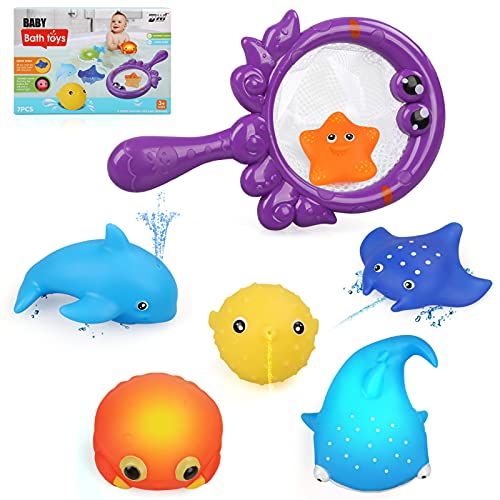 BelleStyle Giocattoli da Bagnetto, Bagno Giocattoli per Bambini, Pupazzetti per Il Bagno, 7 Pezzi Animale da Oceano con Luce Lampeggiante, Rete da Pesca Giochi da Doccia per Bambini di 1 2 3 4 Anni