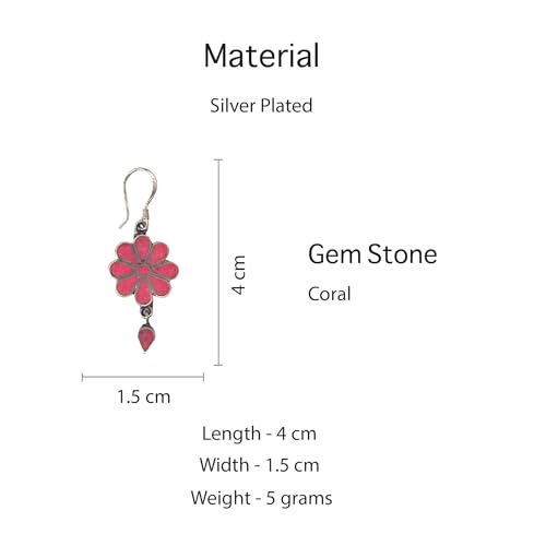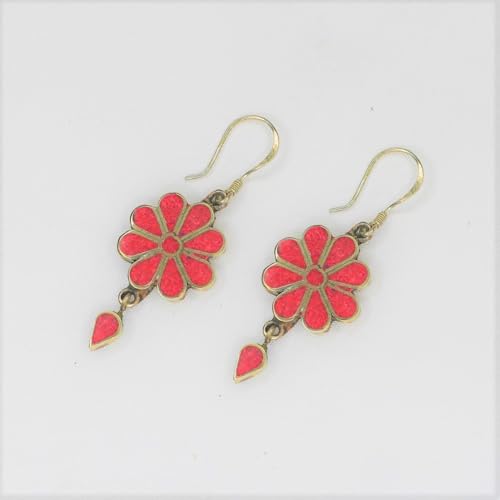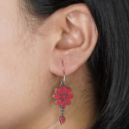 Bellissimo Fatti a Mano Compresso Corallo Rosso Pietre Preziose Intarsio Forma di Fiore Moda Orecchino per Donne Placcato Argento 925 Etnico Zingaro Boho Orecchino Gioielli