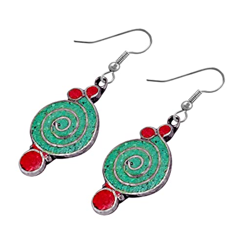 Bellissimo Fatto a Mano Compresso Turchese e Corallo Intarsio di Pietre Preziose Goccia Orecchino per Donne Adolescenti 925 Argento Placcato Etnico Zingaro Moda Festa Orecchini Gioielli