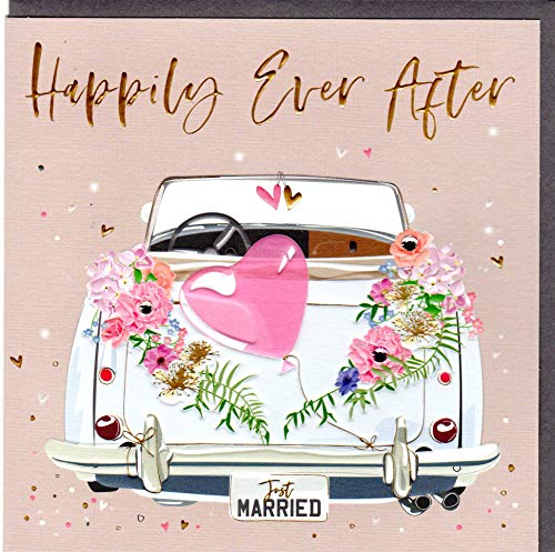 La scritta “Happily Ever After” e l'elegante auto da matrimonio trasmette un messaggio caloroso alla coppia di sposi in un design sofisticato.