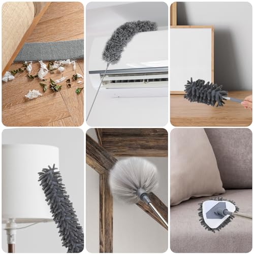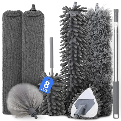 Set di 8 spolverini a ragnatela: questo set di piumino in microfibra include: 1 asta allungabile in acciaio inox, 1 panno per la polvere pieghevole in microfibra, 1 panno per la polvere in ciniglia, 1 panno per la polvere piatto, 1 panno piatto per la pulizia come ricambio, 1 mini panno per la polvere con asta estensibile, 1 panno per la polvere a ragnatela, 1 pennello triangolare. Testa di stella. Pulire le aree alte sostituendo diversi tipi di testine per spazzole.