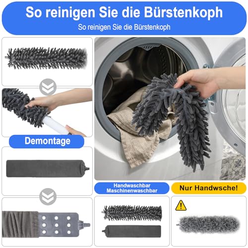 Spolverino in microfibra di alta qualità: panno in microfibra realizzato in microfibra di alta qualità, microfibra con una forte capacità di assorbimento elettrostatico durante l'uso, attira facilmente polvere, polline e capelli, risparmiando forza e tempo. La sua soffice microfibra e il cappuccio in silicone sulla parte superiore assicurano che la superficie del divano, della parete o dei mobili non venga graffiata durante il processo di pulizia.