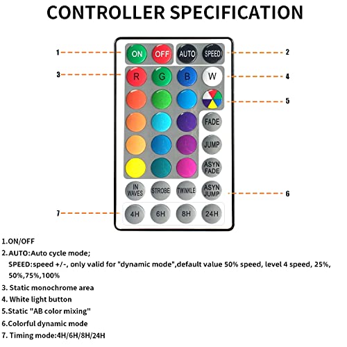 【Cambia i colori con il telecomando】Puoi selezionare fino a 8 modalità (FADE, JUMP, ASYN FADE, ASYN JUMP, ecc.) E 16 colori (BIANCO, ROSSO, BLU, VERDE, ROSA, ecc.) con telecomando, cambia il colore della luce del cerchione come preferisci, controlla la distanza fino a 5 m.