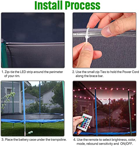 【Facile da installare】La striscia luminosa flessibile ti consente di piegare o modellare liberamente, basta legare la striscia LED attorno al perimetro del cerchio con le fascette. Quindi posizionare la custodia della batteria sotto il trampolino e utilizzare il telecomando per selezionare luminosità, colore, modalità, impostazione del timer e ON/OFF.