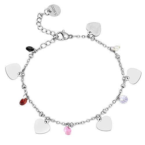 Beloved Bracciale Rainbow Crystal donna in acciaio inossidabile con charms - con cristalli multicolor - regolabile fino a 21 cm con moschettone (Cuore, Silver)