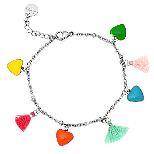 ❤️ Bracciale da donna in acciaio inossidabile con charms smaltati colorati e nappine in cotone
