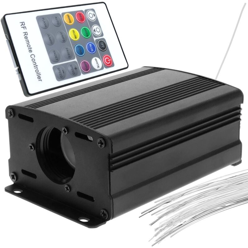 Illuminazione a LED con propagazione in fibra ottica. La combinazione di fibra ottica con un generatore di luce a LED ottiene effetti spettacolari e ci sono molte applicazioni. Il sistema è costituito da un generatore di luce LED (illuminatore) a cui è collegata la fibra ottica. La luce si propaga attraverso la fibra ottica fino a raggiungere l'estremità opposta della fibra ottica, splendendo intensamente. La sorgente luminosa a LED (illuminatore) è l'unico componente che richiede alimentazione e può essere nascosto ovunque al sicuro. I cavi in fibra ottica sono isolati, sicuri, possono essere installati all'aperto, in acqua, aree infiammabili e non generano calore dall'illuminazione. Ideale per illuminazione e decorazione, illuminazione per interni, realizzazione di soffitti stellati, illuminazione da giardino, insegne commerciali, ecc. Un'installazione di illuminazione a LED con propagazione in fibra ottica richiede due parti chiaramente differenziate: L'emettitore di luce a LED