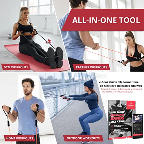 per il torso, le gambe, gli addominali, la schiena, le braccia o lo stretching.Mettete insieme il vostro programma di allenamento in base alle vostre esigenze individuali con questo set premium di 13 parti.I 5 tubi colorati realizzati in lattice naturale al 100% con due strati di diverso spessore consentono di raggiungere fino a 64 livelli di resistenza e sono quindi il dispositivo di allenamento perfetto per la casa, l'ufficio e per quando sarete in viaggio.