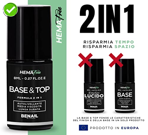 Benail Base e top coat Semipermanente con effetto extra-lucido fino alla rimozione, unghie Gel, resistente, elastica e autolivellante da 8 ml.