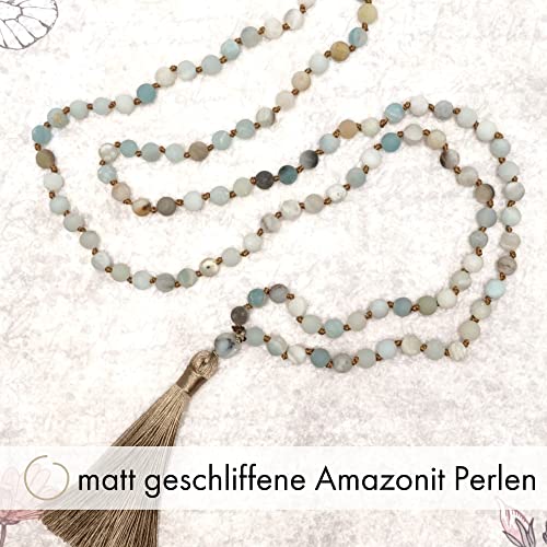 Una fantastica collana di perle di amazzonite selezionate a mano. Questo gioiello è lavorato con amore e irradia armonia e serenità con le sue pietre preziose opache. In coordinato con le perle abbiamo inserito un nappa luccicante in oro come elegante punto luce.
