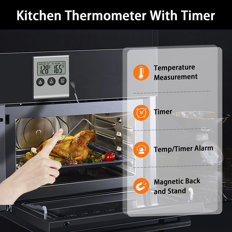 MIGLIORE DESIGN PREMIUM: Questo termometro per carne digitale è realizzato in materiale robusto. Anche se lo fai cadere accidentalmente, non si indebolirà nel tempo. Il termometro da cucina ha un display di alta qualità. Stabile: Il sigillo consente di utilizzare apparecchiature come termometri per il bagnetto, latte, caffè, cioccolata calda, caramelle e olio per friggere. Inoltre, viene fornito con un magnete (che può essere fissato a qualsiasi corpo metallico) e un gancio per riporlo facilmente. LETTURA PRECISA E SUPER VELOCE + FUNZIONE DI MEMORIA: Basta scuocere ecc. perché il termometro da cucina determina la temperatura in 2-3 secondi. Può misurare con precisione temperature da -50°C a 300°C. Inoltre, la sua funzione di memoria rende facile controllare le temperature minime/massime passate. Sonda resistente ai batteri: Questa sonda è resistente ai batteri, il che significa che puoi usarla su tutti gli alimenti (ad es. tacchino di Natale, torte di pollo, torte di agnello