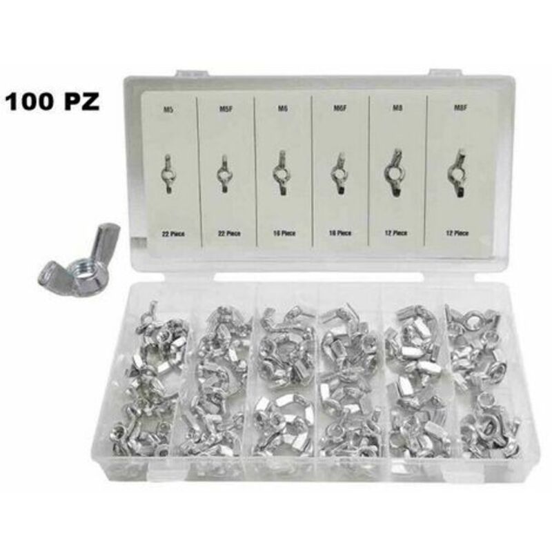 Set di dadi a farfallamisti 100 pezzi.set di dadi a farfalla in acciaio cromato in box da 100 pezzi.misure:m5 -- 22 pz -- m5f -- 22 pzm6 -- 16 pz -- m6f -- 16 pzm8 -- 12 pz - m8f -- 12 pz