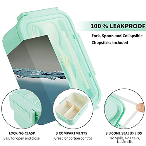 Bento Lunch Box per Adulti / Bambini con 3 Scompartie Posate, Porta Pranzo Ermetico Adatto per le Merende dei Bambini o per i Pranzi in Ufficio,1400ml - Verde