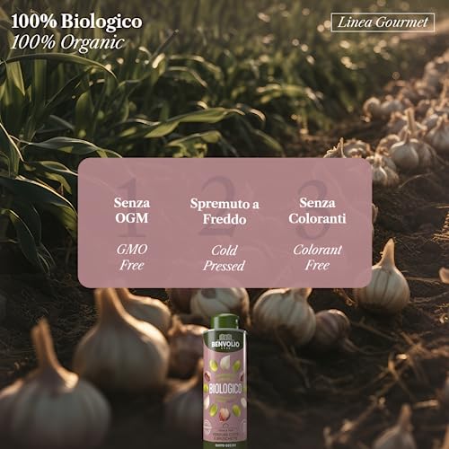 BENVOLIO Olio All'Aglio Biologico 250 ml | Gusto Deciso, Ideale per Verdure, Bruschette e Carni - Estratto a Freddo -Ricco di vitamina E. Sostiene Funzione Immunitaria e Stress Ossidativo