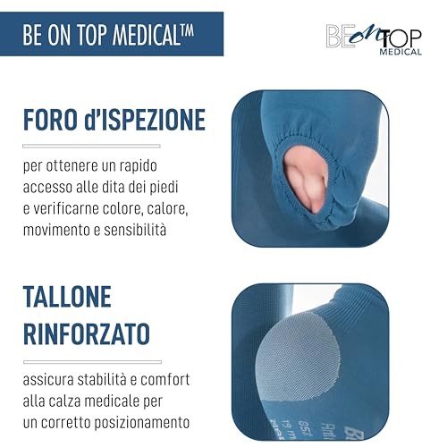 CALZE COMPRESSIONE UNISEX: Grazie al loro design sobrio e versatile, questi gambaletti medicali possono essere indossati con facilità sia da uomini che da donne. Le calze contenitive Be On Top Medical non solo sono efficaci nella profilassi della tromboembolia pre e post operatoria, ma offrono anche il massimo comfort grazie al tallone rinforzato e al foro d'ispezione.