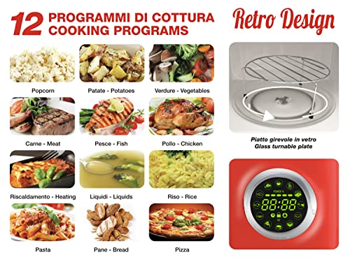 Beper 90.890R Forno Microonde 20 L Design Retro con 5 Livelli di Potenza, 8 Programmi Funzione Grill e Defrost, 20 Litri, Vetro, Rosso