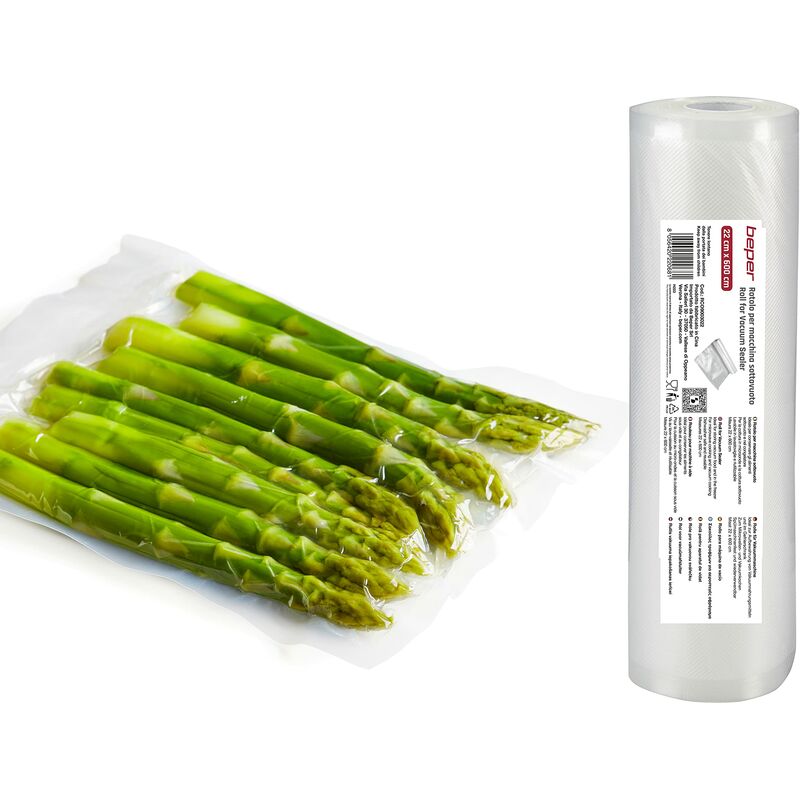 Rotolo per macchina sottovuoto ideale per conservare gli alimenti ermeticamente e più allungo. I rotoli possono essere utilizzati per la cottura in microonde e la cottura sottovuoto. Potrai inoltre utilizzarli in lavastoviglie e nel congelatore rendendoli un accessorio versatile ed essenziale in ogni cucina. Riutilizzabili e privi di BPA.Questi rotoli hanno un disegno punteggiato in rilievo che consente la massima estrazione d'aria, mantenendo il vostro cibo conservato ermeticamente più fresco fino a cinque volte più a lungo rispetto ai metodi di conservazione tradizionali.QI rotoli sottovuoto Beper sono universali e progettati per l'uso con tutte le macchine sottovuoto. Con 22 cm di larghezza e 6 metri di lunghezza è possibile decidere la dimensione del sacchetto di cui hai bisogno, sigillando un'estremità del rotolo e tagliando la lunghezza desiderata, rendendoli molto più economici rispetto all'acquisto di sacchetti prefabbricati.