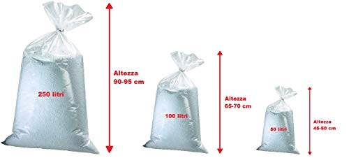 FORMATO: 50 litri. Le sfere di polistirolo hanno diametro misto dai 2 ai 8 mm. Il riempimento è disponibile con diverso peso volumetrico: 50, 100, 250, 500 litri.