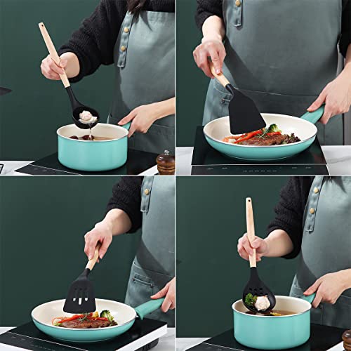 Berglander Set di Utensili da Cucina in Silicone 38 Pezzi Antiaderenti, Utensili da Cucina con Manico in Legno con Ganci Muti-Uso e Portautensili (Nero)