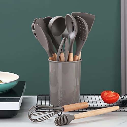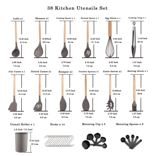 Berglander Set di Utensili da Cucina in Silicone 38 Pezzi con Manico in Legno con Ganci Muti-Uso e Portautensili (Grigio)