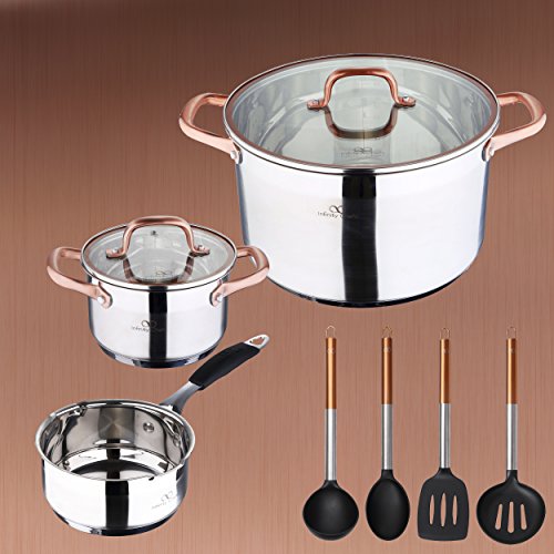 Le pentole INFINITY sono realizzate in acciaio inox, un materiale estremamente durevole e è praticamente impossibile che si usura. È dotato di un coperchio in vetro cornice in un sottile cerchio colore rame che consente di controllare la cottura dei cibi senza necessità di levantarla, con un' apertura per il scarico del vapore.