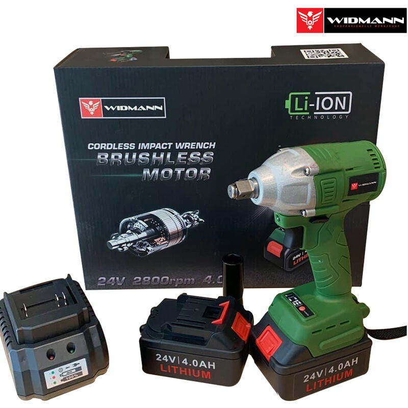 Widmann WM-IW24V: Avvitatore a batteria 24V 4.0Ah Funzione chiave Funzione cacciavite Funzione trapano Avvitatori ad impulsi WIDMANN 24V 4ah Velocità a vuoto: 0-2800 giri / min Coppia massima: 260-280 N.M < 1/2 quadrato 2 velocità e indicatore della batteria Motore senza spazzole Velocità di carico: 2800 rpm Batteria: Li-ion al litio Tempo di ricarica veloce: 1 ora Con indicatore LED di carica della batteria Voltaggio: 24 Volt Intensità: 4.0 Ah Dimensioni (L x P x A): 284 x 260 x 108 mm Peso 1,8 kg
