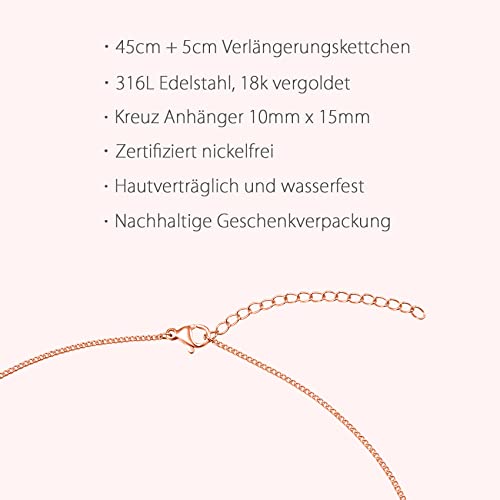 DAY BERLIN: Collana da donna con croce "Cross Fine" in oro rosa, placcata in oro 18 carati. Collana con ciondolo a forma di croce (15 x 10 mm). Catena in filigrana in acciaio inox 316L, 45-50 cm, lunghezza variabile con 5 cm di estensione e chiusura a moschettone. Progettato a Berlino
