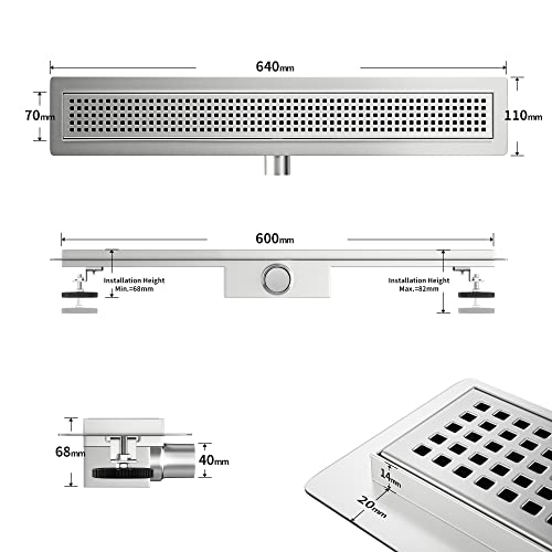 Dimensioni: lunghezza 600 mm, larghezza 70 mm, uscita centrale 40 mm. Gli adattatori filettati DN40 e DN4050 sono inclusi nella confezione, che possono collegare lo scarico lineare al tubo di scarico corretto.
