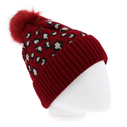 Berretto Donna Leopardato Bordeaux - Berretto Invernale a Maglia Caldo e Denso con Pom Pom Stesso Colore - 100% Acrilico - Capello Tendenza e Originale Modello Animale - Taglia Unica
