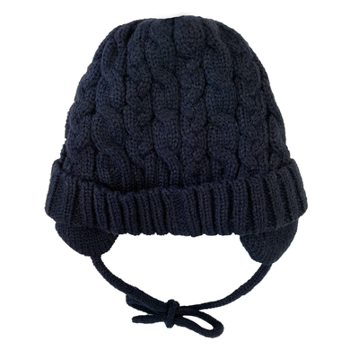 Bellissimo berretto in blu con paraorecchie in maglia e laccetti. La fascia si adatta bene alla testa ed è ideale per il vostro piccolo. <