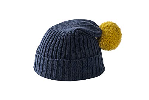 Berretto con pompon double face unisex per donna, uomo e bambino, caldo berretto invernale con pompon, 100% cotone italiano blu navy/giallo. S