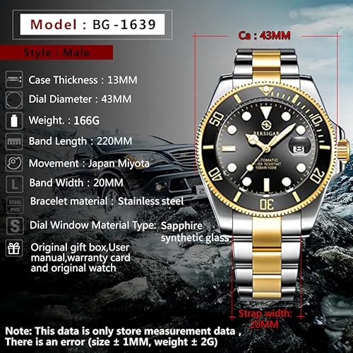 Movimento automatico giapponese e impermeabile: gli orologi meccanici da uomo di Bersigar sono alimentati da un movimento automatico giapponese ad alta precisione. Il nostro orologio è impermeabile fino a 10 bar. È adatto non solo per gli sport acquatici quotidiani come il lavaggio delle mani, il lavaggio dell'auto e il contatto con la pioggia, ma anche per sport con l'acqua come lo snorkeling e il nuoto.