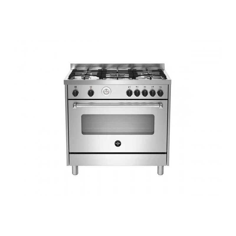 Bertazzoni La Germania Americana AMN965EXT. Tipo di prodotto: Cucina, Colore del prodotto: Acciaio inox, Tipo di controllo: Manopola. Tipo di piano cottura: Gas, Numero totale di fuochi: 5 Fornello(i), Numero di fuochi: 5 Fornello(i). Dimensione del forno: Largo, Sorgente di alimentazione del forno: Elettrico, Capacità netta del forno: 85 L. Regolazione altezza: 6 cm. Classe efficienza energetica: A, Consumo energetico (convenzionale): 0,99 kWh, Potenza aggregata (elettrica): 3500 W