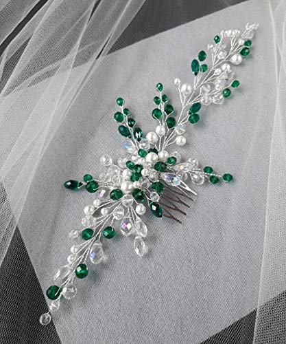 BERYUAN - Pettine da donna con perle color verde smeraldo e cristalli, accessorio per capelli, accessorio per matrimoni, ideale come regalo per la sposa, damigella d'onore (argento)