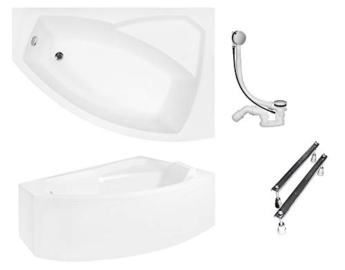 BESCO RIMA Vasca da bagno 130 x 85 cm, in acrilico, set grembiule per sifone, vasca angolare, design moderno, scarico a destra (vasca + grembiule + scarico + volte)
