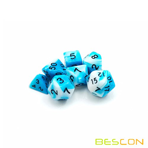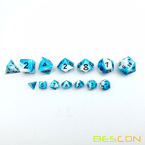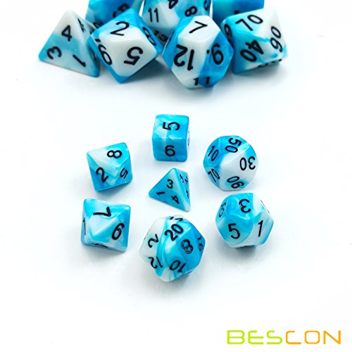 These are amazing tiny gemini polyhedral dice set. With half size of normal RPG dice, this set is so small to hold in hand. They are beautiful swirled two-tone effect, contains one d4, one d6, one d8, one d10, one d%, one d12, and one d20. You will fall in love playing with them!