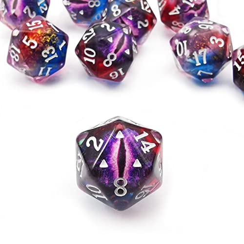 Dragon Eye D20 5pcs Set: Each Set contains 5pcs D20, 1 for each color of Red, Green, Blue, Purple and Exotic Aqua. They are standard sized D20 with 20MM face to face.