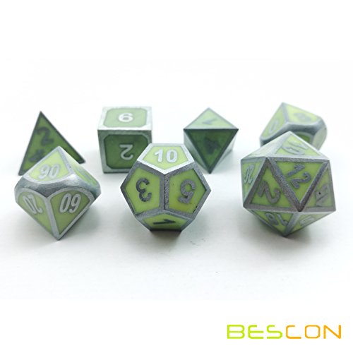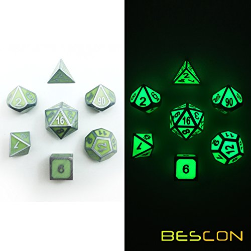 Bescon Super Glow in The Dark Metal Polyhedral D&D Dice Set of 7 Luminous Metallic Rpg Role Playing Game Dice 7pcs Set D4-D20