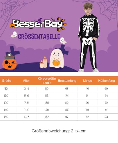 BesserBay Costume da scheletro per bambini, con cappuccio, colore nero, con cappuccio e tasca 104