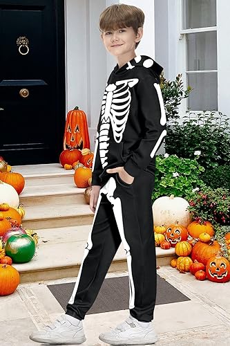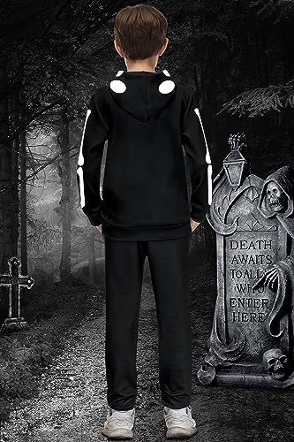 Il fantastico costume da scheletro per feste di Halloween per bambini è composto da una felpa con cappuccio e pantaloni.