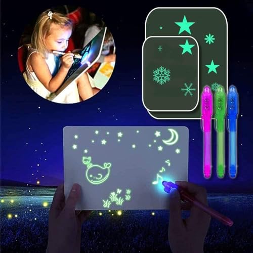 MEGA SET: 2 tavole da disegno (A4 e A5 ciascuna), 3 penne da disegno, stencil da disegno, penna luminosa (bagliore temporaneo) e pennarello (colore UV permanente) per un divertimento multiplo
